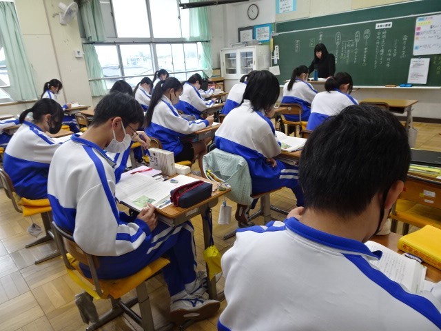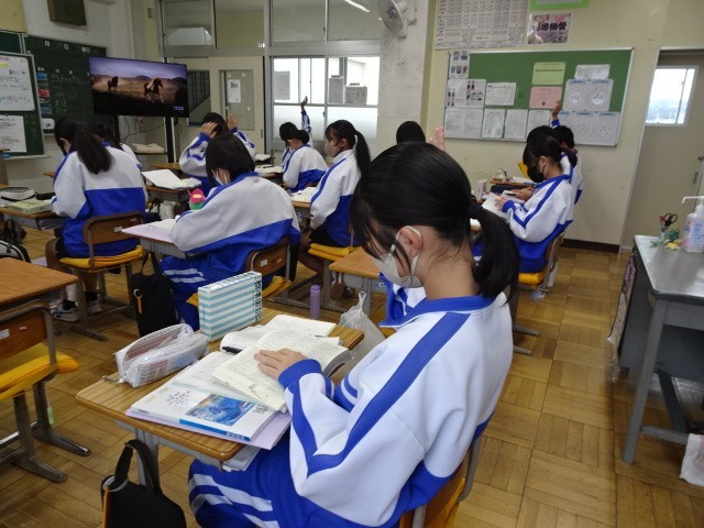 2年A組は国語です。物語文「小さな手袋」(内海隆一郎)に入っています。「人びとの忘れもの」という本の中に収められている短編です。読みや意味が分からない語句は、手元の辞書で確認していました。