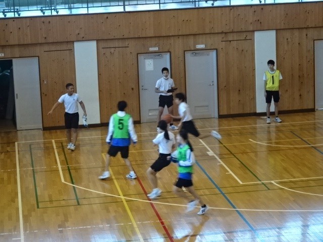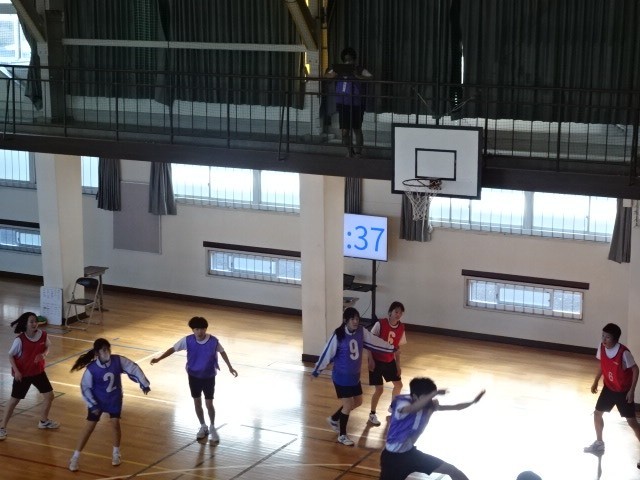 3年B組保体です。バスケットボールの学習です。試合を行いながら、動きを動画撮影したり指示を出したりしていて、ゲームが盛り上がっていました。