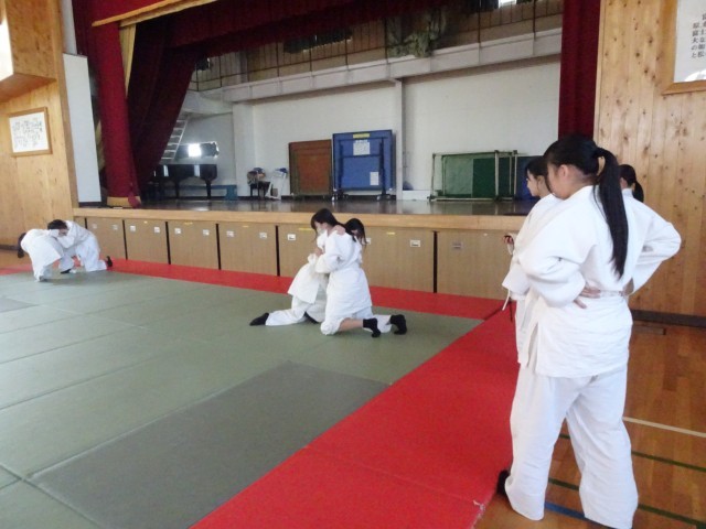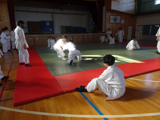 2年B組は保体です。柔道でした。座って背中合わせの状態から、振り向いて片足立ち膝での対戦をしていました。相手の体勢を崩して何とか寝技に持ち込もうと、足の位置を変えたり、押したりと工夫していました。
