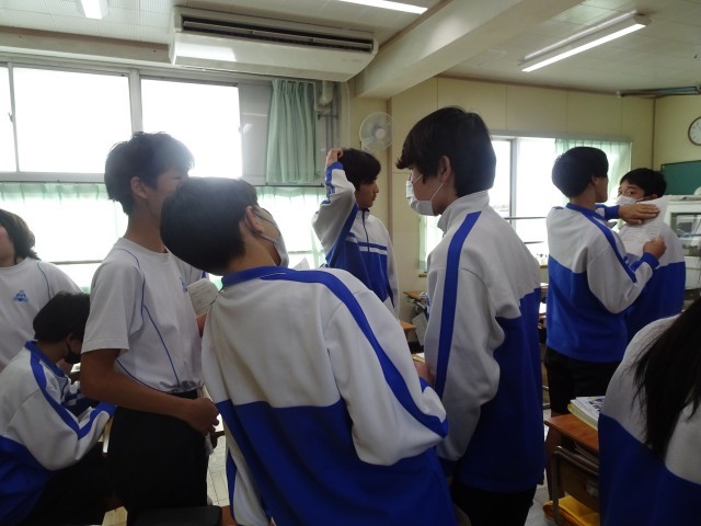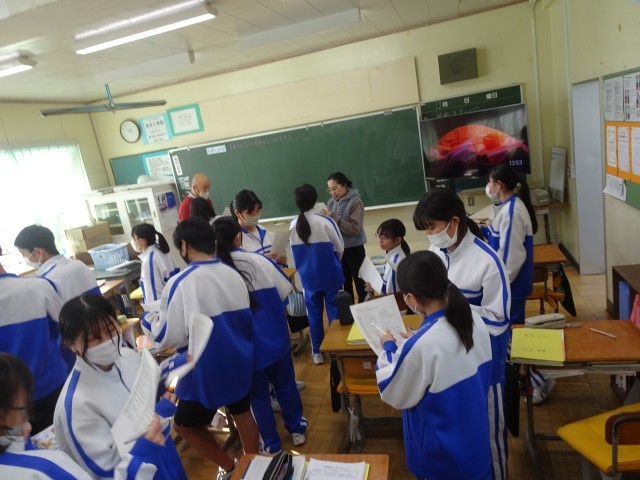 2年B組は英語です。暗唱した課題文のテストです。いろいろな仲間と覚えた文を言い合い、自信をつけてからALTや担当教員のところにチャレンジに向かっていました。