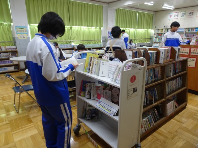 2年A組は国語です。生徒、教員アンケートにより、JRCからの寄贈本として新しい本が63冊入りました。ビブリオバトルをこれから行うことを考えているので、今日はその選定も兼ねています。