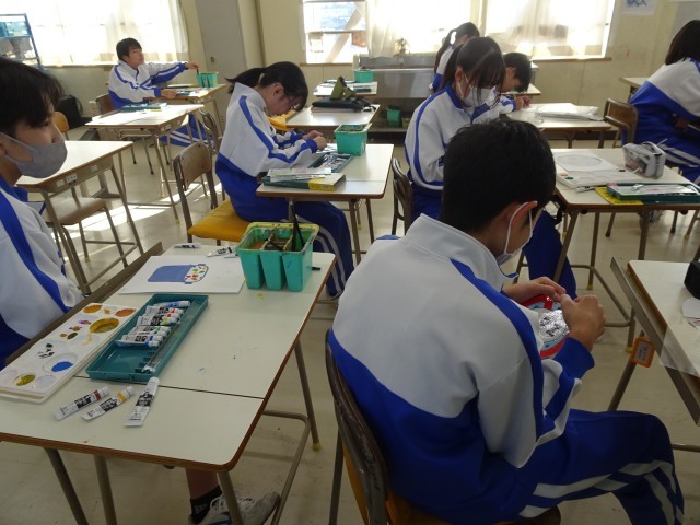 2年B組は美術です。今まで取り組んできた「ピクトグラム」が完成に近づいてきました。微妙な線や色にこだわり精度を高めようと悩んでいる生徒もいます。