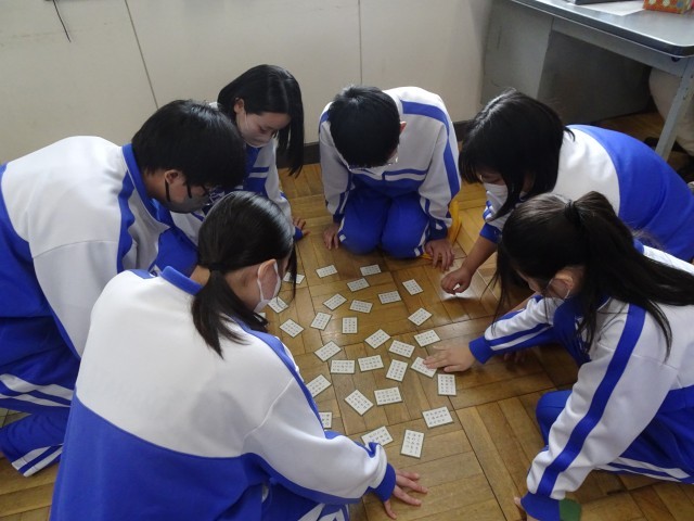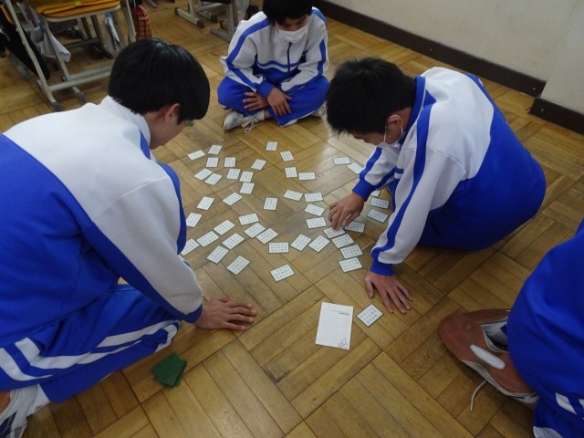 3年B組は国語です。百人一首大会の予選会を兼ねています。これは順位決定戦の様子です。途中から猛然と札を取る生徒もいて盛り上がっていました。