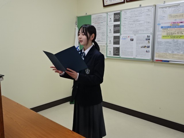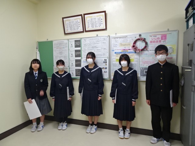 本日から3学期がスタートしました。登校が今までより早い生徒もおり、気持ちを新たにしようという意欲を感じました。代表生徒の言葉は、1年生と3年生です。目標が明確でした。3年生の代表生徒が欠席のため、担任が代読です。式の終了後、表彰を行いました。3学期もよろしくお願いします。