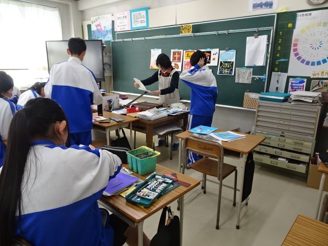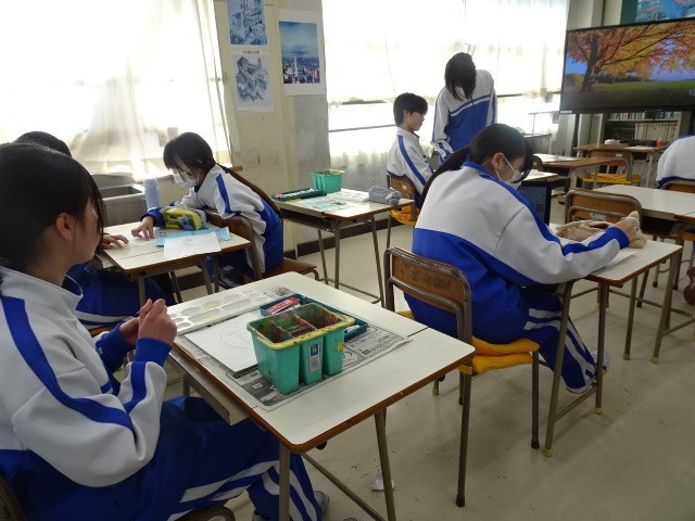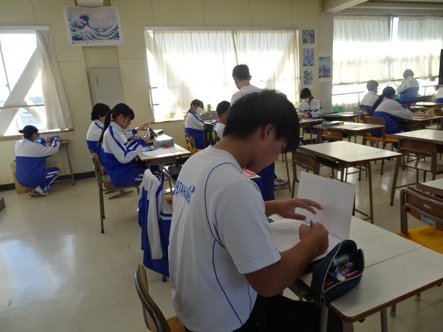 1年B組は美術です。漢字1文字のデザイン画の完成がそろそろ見えてきました。自分で「土」「雷」「魚」などの漢字を選び、工夫して表現していました。また、作成者の名前もその文字に合わせてデザインしていて「なるほど」と思いました。
