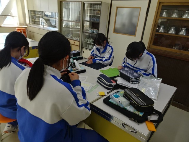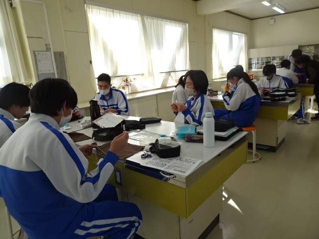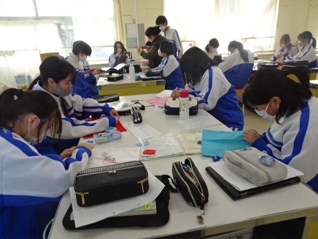 3年B組は技術家庭の家庭です。裁縫で、「刺し子」に挑戦していました。自分で型を選び、その線の通りに縫って行きますが、間隔が狭いので骨が折れます。でも、助け合い声を掛け合いながら進めていました。