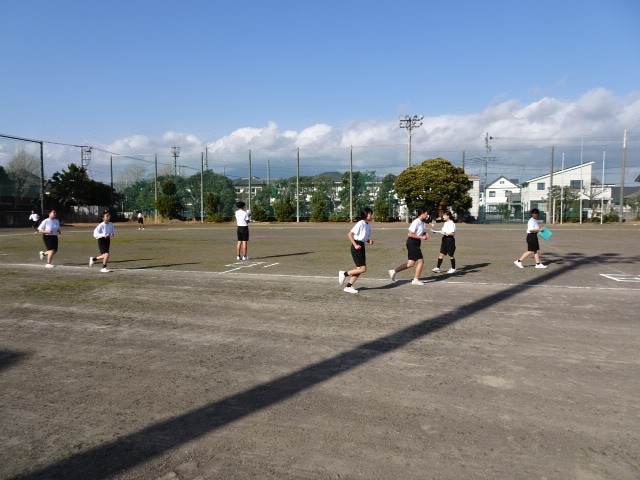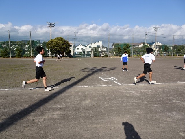 2年B組は保体です。長距離走で、10分間走に挑戦していました。普段、10分を自分のペースで走ることがないので、きつそうでした。仲間が、「もう少し」「ここまで来よう」などと声を掛けて励ましていました。