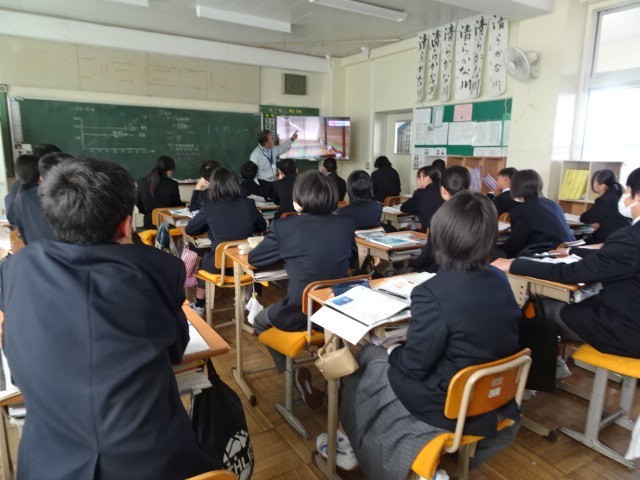1年B組は理科です。地震のメカニズムの学習でした。どのように揺れが伝わるのか、NHK ONE for Schoolの映像で鉄球の動きを見て、P派とS派についての理解を深めていました。