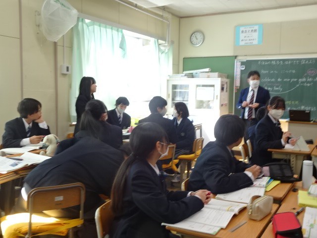 1年A組は英語です。「冬休みの様子をはがきで伝えよう」という単元学習です。まずは、教科書の例文を読んで内容を確認したました。その上で、「Where did you go?」などの質問を受け、冬休みや正月に行ったところ、何をしたかなどを思い出し、英文に直して発表しました。