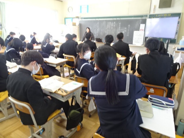 3年B組は国語です。魯迅の「故郷」という話を読み解いていました。作者がこだわったであろう表現の仕方ついて考えていました。例えば、「灰色」ではなく「鉛色」という表現。単なる色の違いだけでないこだわりがありそうです。