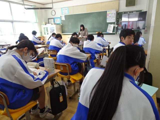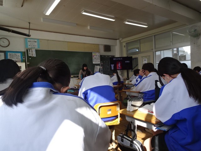 2年A組は国語です。太宰治の小説「走れメロス」に入りました。師範読みを教師が行い、大体の話の流れをつかみ、疑問に思ったことなどをチェックしていきました。