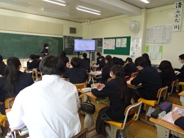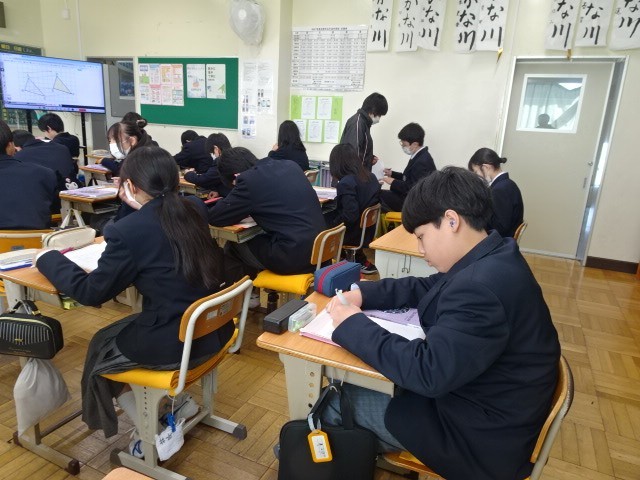 1年A組は数学です。図形の移動の学習です。一つの三角形と全く同じ図形(合同な図形)を平行移動させて描く学習です。条件を理解できるとスムーズにできるのですが、苦戦していました。
