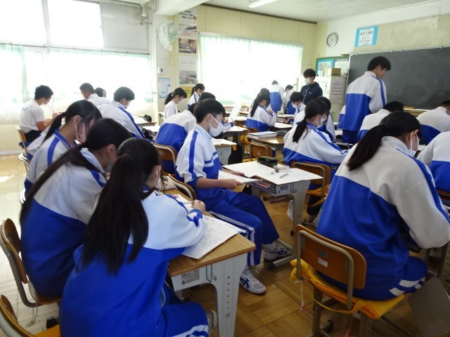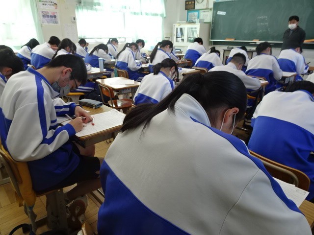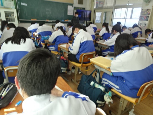 3年生は、明日の私立高校の入試に備えて、最後の追い込みです。3年B組では数学、3年A組では英語の単元や対策プリントにチャレンジしていました。