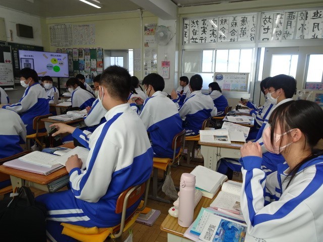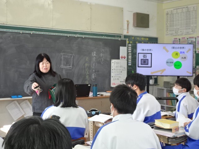 3年B組は国語です。物語文「故郷」の続きです。纏足を履いていた登場人物である「楊おばさん」の人となり等をイメージしやすくするため、生徒に「纏足」を見せていました。実際に見ると、普通では考えられない足の大きさや形がイメージでき、衝撃的でした。