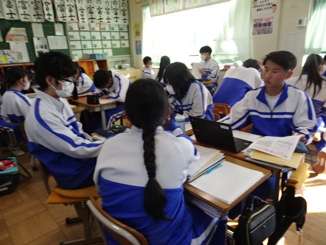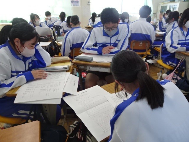 3年A組は英語です。受験対策問題の答え合わせと見直しで、互いに質問したり確認したりしながら理解を深めていました。