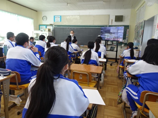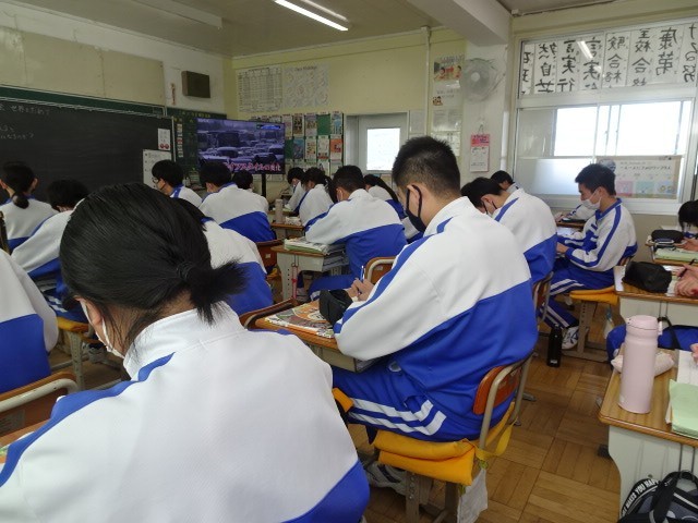 3年B組は社会です。地球温暖化についてNHK for Schoolで映像を見ながら理解を深めました。先日、理科の食物連鎖「森のクマさん」での学習でも、似たような課題で学んだので、関連して考えることができました。