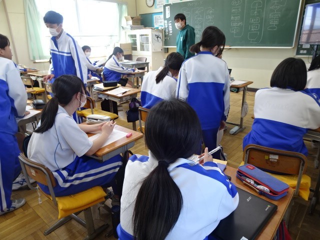 2年B組は技術家庭の技術分野です。プログラミングの学習でした。まずは、身近な行動をみんなで確認しました。その後、例えば、「押しボタン式信号機のある横断歩道を渡るとき」、自分がどうするかをプリントにまとめました。「横断歩道の手前で止まる」→「押しボタンを押す」などという動きを書き込み、どんなプログラムを組む必要があるのかを考えていました。