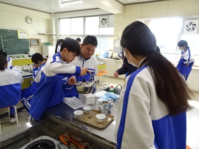 本日は、栄養教諭に来ていただき、食育の授業を行いました。郷土の産物であるお茶について学びました。実際に自分たちでお茶を入れ、入れ方や、一煎目と二煎目の味等の違いも学びました。二煎目は、かなり渋みや苦みが出ていたようです。