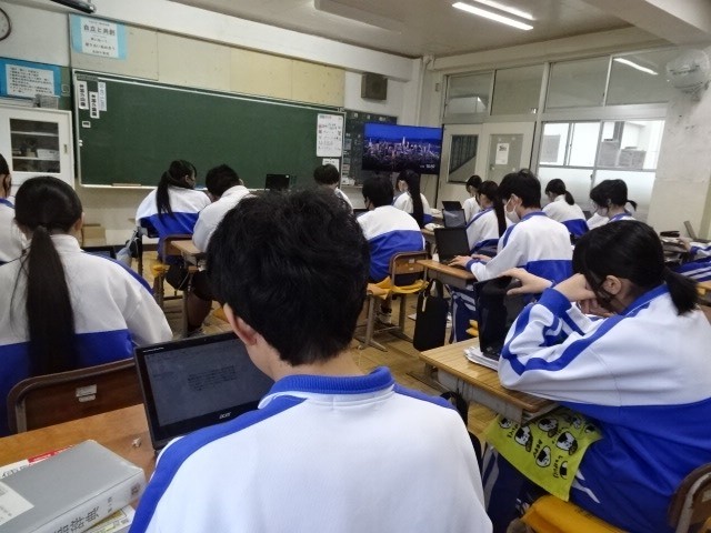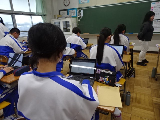 2年A組は国語です。自分の考えを作文にしていました。「環境問題について」「ゲームについて」「制服について」等、日頃自分が考えていることをテーマに決め、意見文にします。まずは、思いついた内容をChromebookに打ち込んでいきました。