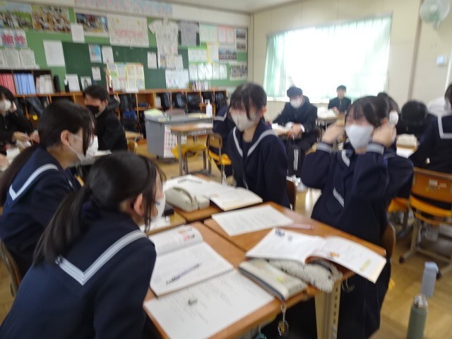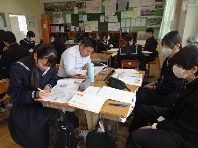 2年A組は道徳です。『帰郷』という読み物教材を使って考えていました。母親が入院したことをきっかけに、都会から急いで見舞いに行く主人公の思いに触れ、感謝や思いやりについて考えました。