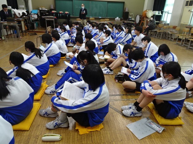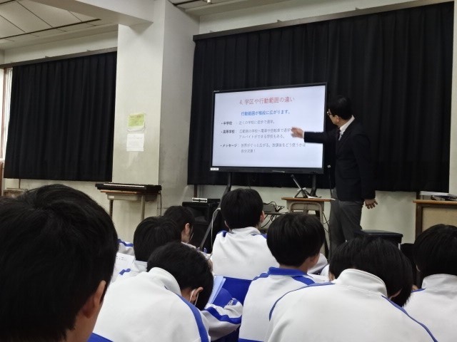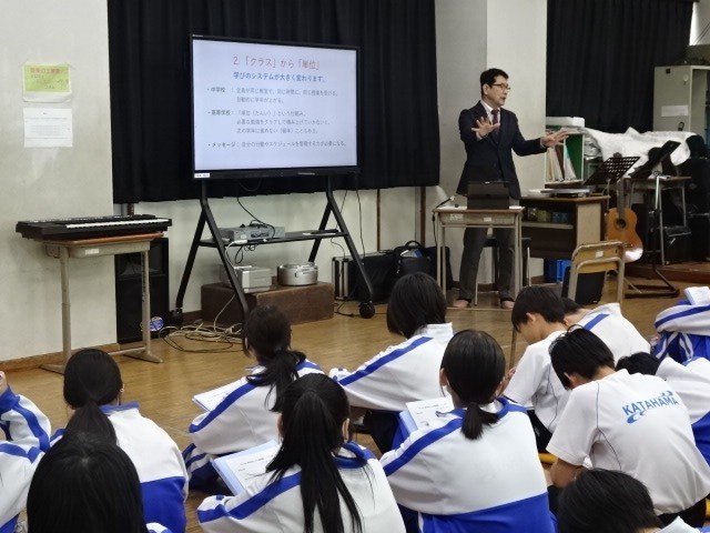 1年生は、現在、「つくば開成学園」で、来年度から「あおい開惺高等学校」となるスクール長が、進路講話に来てくださいました。中学と高校の違い、高校の種類、学部やコースの特徴など、分かりやすい説明でした。高校で専門的な学習をするには中学での日頃の学習の積み重ねが大事であることを強調されていました。話を聞き終えて、生徒の背筋が伸びた気がします。この後、2年生も同様に講話をしていただきました。