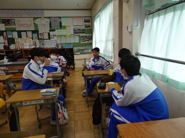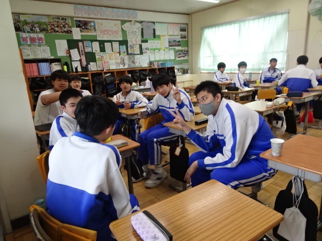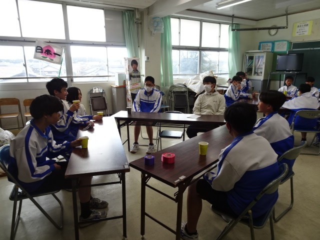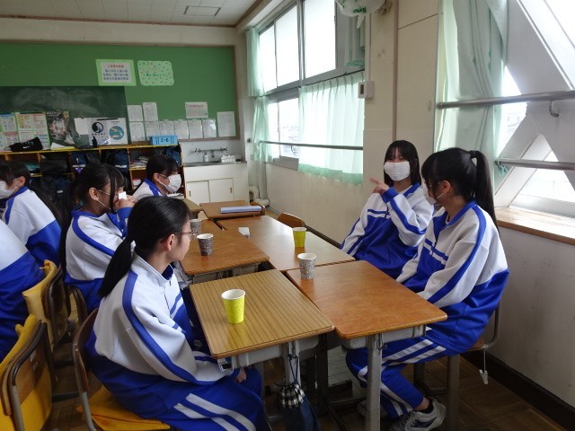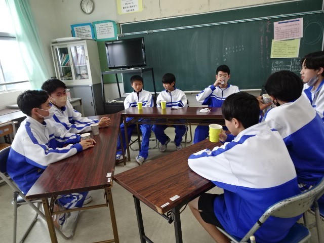 昼休みは、生徒会本部が主催したティーパーティです。緑茶、紅茶などを生徒会本部の役員が用意し、学年毎に調理室に取りに行きました。その後、各グループに分かれました。グループは、各学年が混じるように組まれており、テーマを元に茶飲み話をしていました。