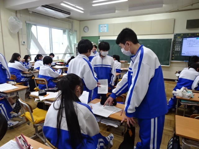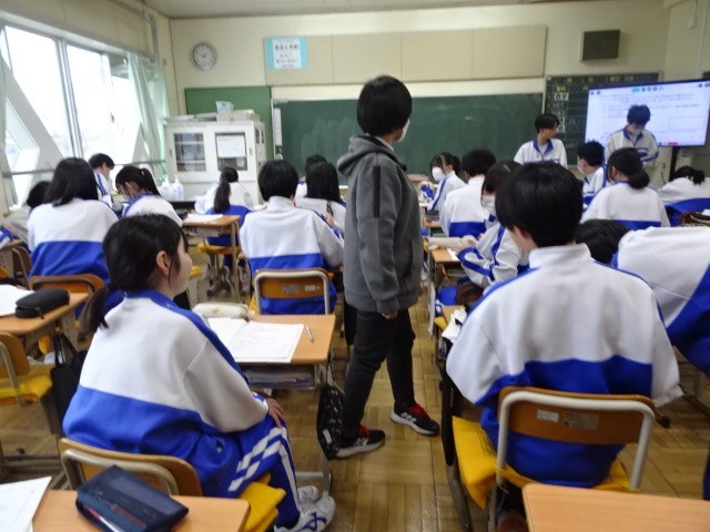 1年A組は数学です。数学の学習も、学年のまとめです。プリントを進め、自己の課題を追究していました。