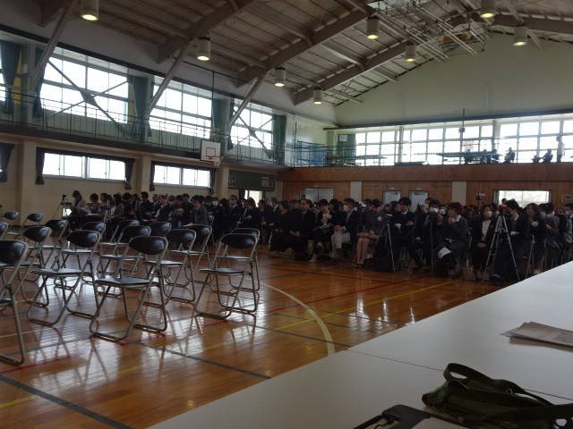 晴れやかな天気の中、第79回卒業証書授与式を挙行しました。入場する卒業生は、緊張しながらも笑顔が見せていました。