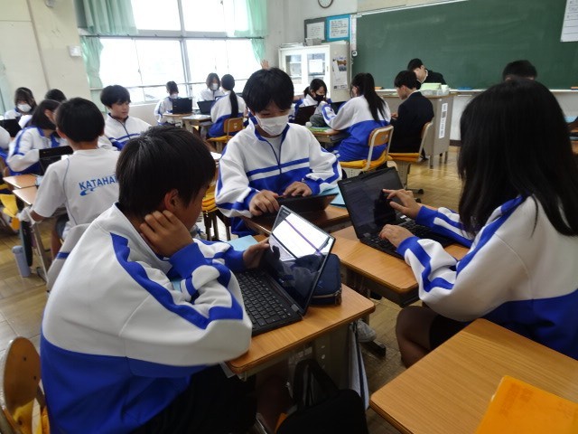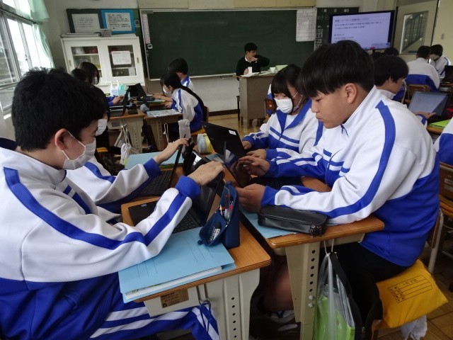 2年A組は技術家庭の技術です。前回の課題であった原子力、火力、水力、(風力)の発電のシステムをグループ内で分担し、調べたことをまとめていました。
