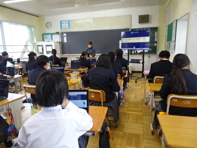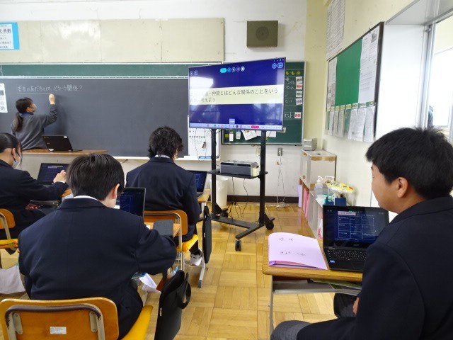 1年A組は道徳です。ケツメイシの「仲間」という曲を聴き、本当の友達とはなにかを考えました。