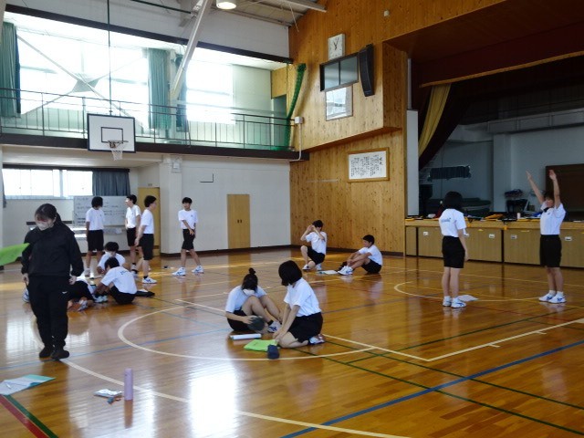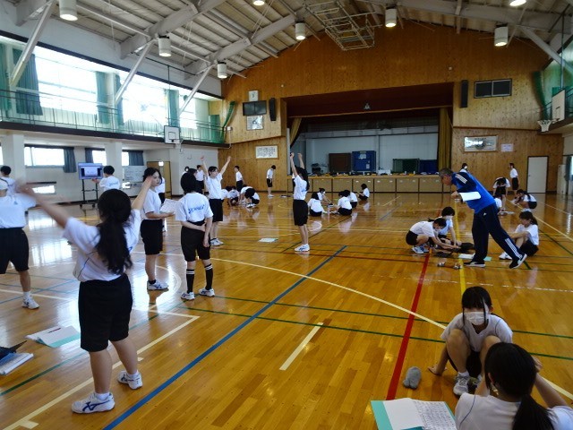 1年A組と2年A組は合同で保体を行いました。ラジオ体操のやり方について、2年生が1年生に見本を見せ、ポイントを教えていました。