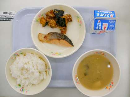 今日の給食は、「ご飯」「鮭の塩麹焼き」「カボチャのそぼろあんかけ」「お味噌汁」「牛乳」です。