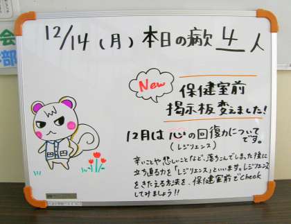 本日の病欠者数は、「4名」です。先週より若干増えてしまいました。これからますます冷えてきますので、体調管理をしっかり行っていきたいですね。ボードには、「心の回復力」について記載されています。