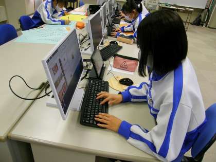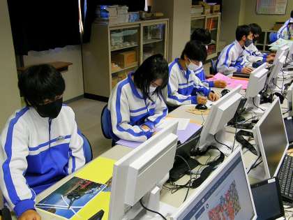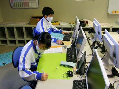 3年A組「言語読解」の授業の様子です。沼津市の歴史や文化、特産物、街の活性化、問題点などについて、自分で決めたテーマを個々で調べ、発表するという流れです。
