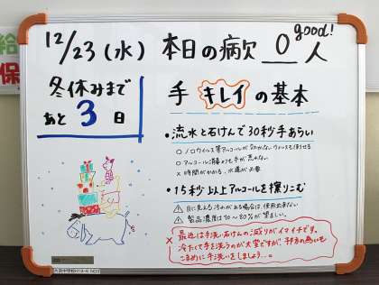 今日の病欠者数は「0名」です。ここのところ0名が続いています。元気よく学校に登校できることは喜ばしいことです。ボードには、カワイイ絵とともに「手洗いの基本」について記されています。手洗いについて、もう一度見直してみてはどうでしょうか。