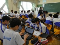 現在、沼津市全体で学校へのケーブル工事が終わっていないので、各学校が一斉にインターネットへ接続するとなかなか繋がらなくなってしまします。ですので、2人組でリスニングを行っています。