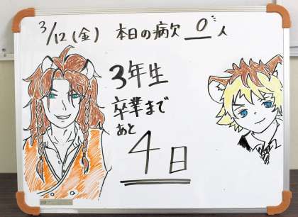 3月12日(金)今日の病欠者数 公開日 2021/03/12 更新日 2021/03/12 記事 今日の病欠者数は「0名」です。今年度もあと数日ですので「0」という数字はよかったと想います。 今日は公立高等学校の合格発表日ですね。結果はいかに?! いいね(0)