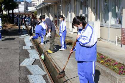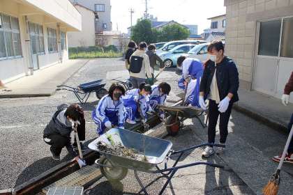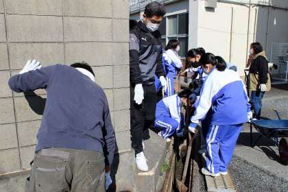さあ、作業開始です!本日の作業内容は、「側溝清掃」「東側防球ネット枯れ木落ち葉清掃」「南側防球ネット草むしり」「グラウンド草むしり」です。