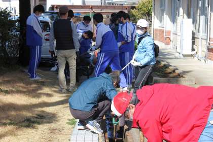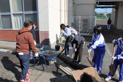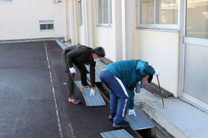 側溝のフタを外した後、ドロを書き出して、一輪車に積み込みます。