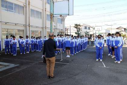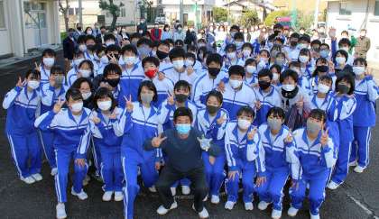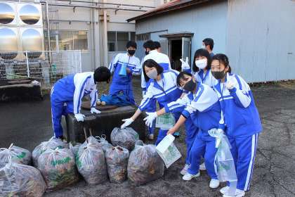 ゴミ袋もこんなにいっぱいです!校長先生から講評をいただき、最後に生徒・保護者の皆さん・教職員で記念にパチリ☆!
