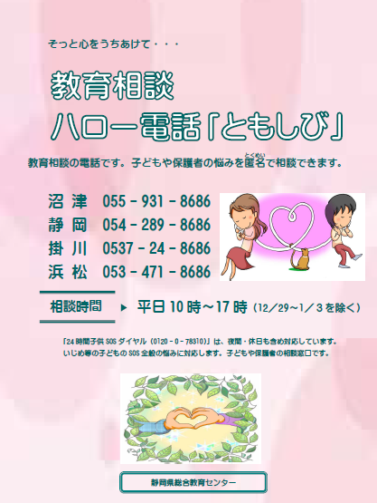静岡県総合教育相談センターでは、子どもや保護者の悩みを匿名で相談できる電話相談事業を開設しています。一人で悩みを抱えずに、ぜひ学校や相談窓口で、気軽にご相談ください。