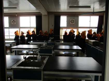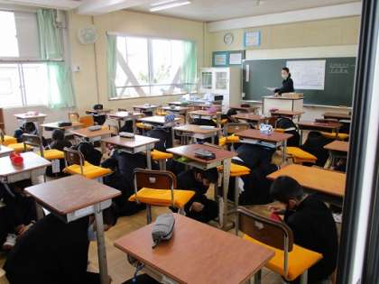 本日9時10分、沿岸への津波を想定した防災訓練を実施しました。1年生は、マニュアルに従い机の下に入り、その後速やかに最上階へ移動しました。