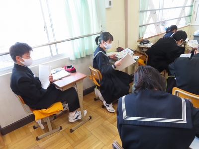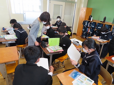 2B社会:「なぜアメリカは農作物を大量に生産できるのか」ということを課題に考えています。グループでお互いの意見を伝え合っていました。