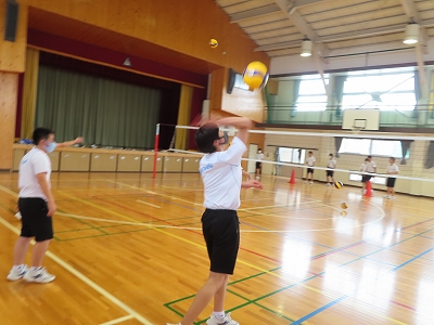 3B体育:バレーボールのサーブの練習を行っています。ボールの流れを一方通行にして、安全に配慮しながら授業が進んでいました。