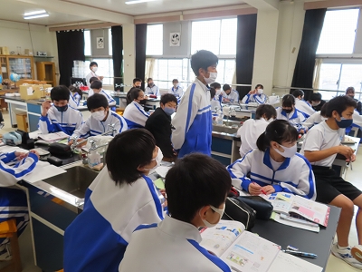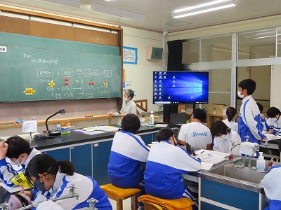 2B理科:「有機物の燃焼」の学習です。実験で分かったことをもとにしながら、化学反応式を考えています。モデルを使って、わかりやすく授業が進んでいます。