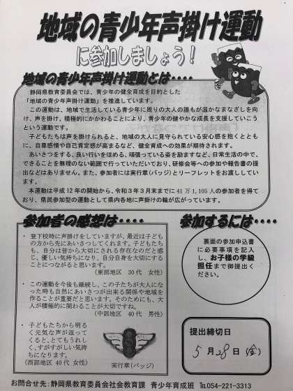 静岡県教育委員会より、「地域の青少年声かけ運動」への参加の依頼文書が届きました。各家庭へも配布しますので、一読ください。参加を希望される方は、必要事項を記入の上、学級担任までご提出ください。よろしくお願いいたします。