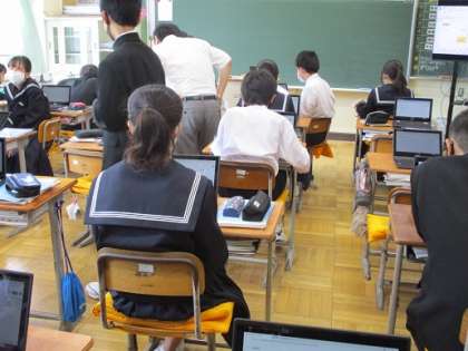 1A数学:Chrome book を使って式の計算に取り組んでいます。担当教員の開発したソフトで、途中での計算ミスも発見できます。+、−の処理に戸惑いながらもみんな真剣に取り組んでいました。