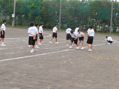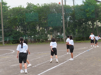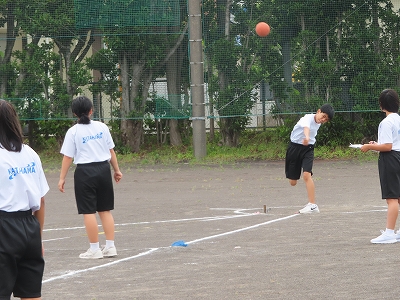 1A体育:体力テストのハンドボール投げを行っています。2グループに分かれ、投げる側と記録する側を行っていました。1年生は初めてのハンドボール投げです。頑張っていました。