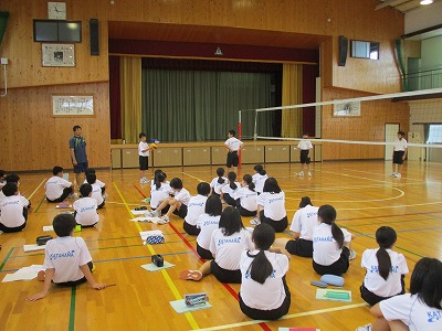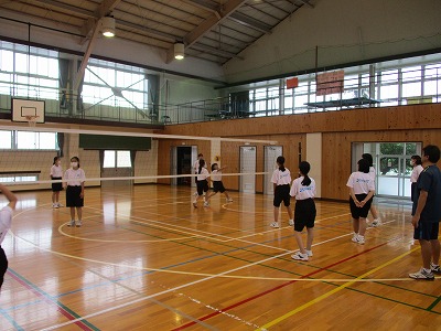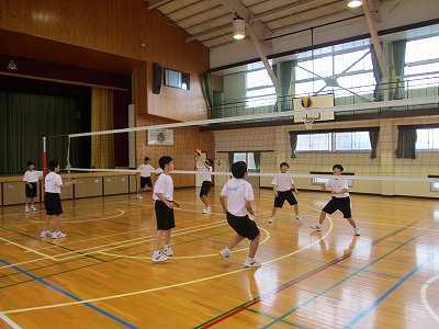 1B体育:バレーボールのミニゲームです。2対2の中で、ポジショニングについて考えています。2人の位置関係は?それぞれの体の向きは?3段攻撃に向けて競技理解を深めています。