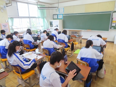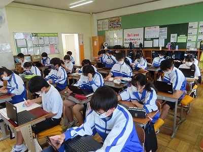 職業調べについてクロームブックのプレゼンソフトでまとめています。自分の関心の高い職業を熱心に調べています。